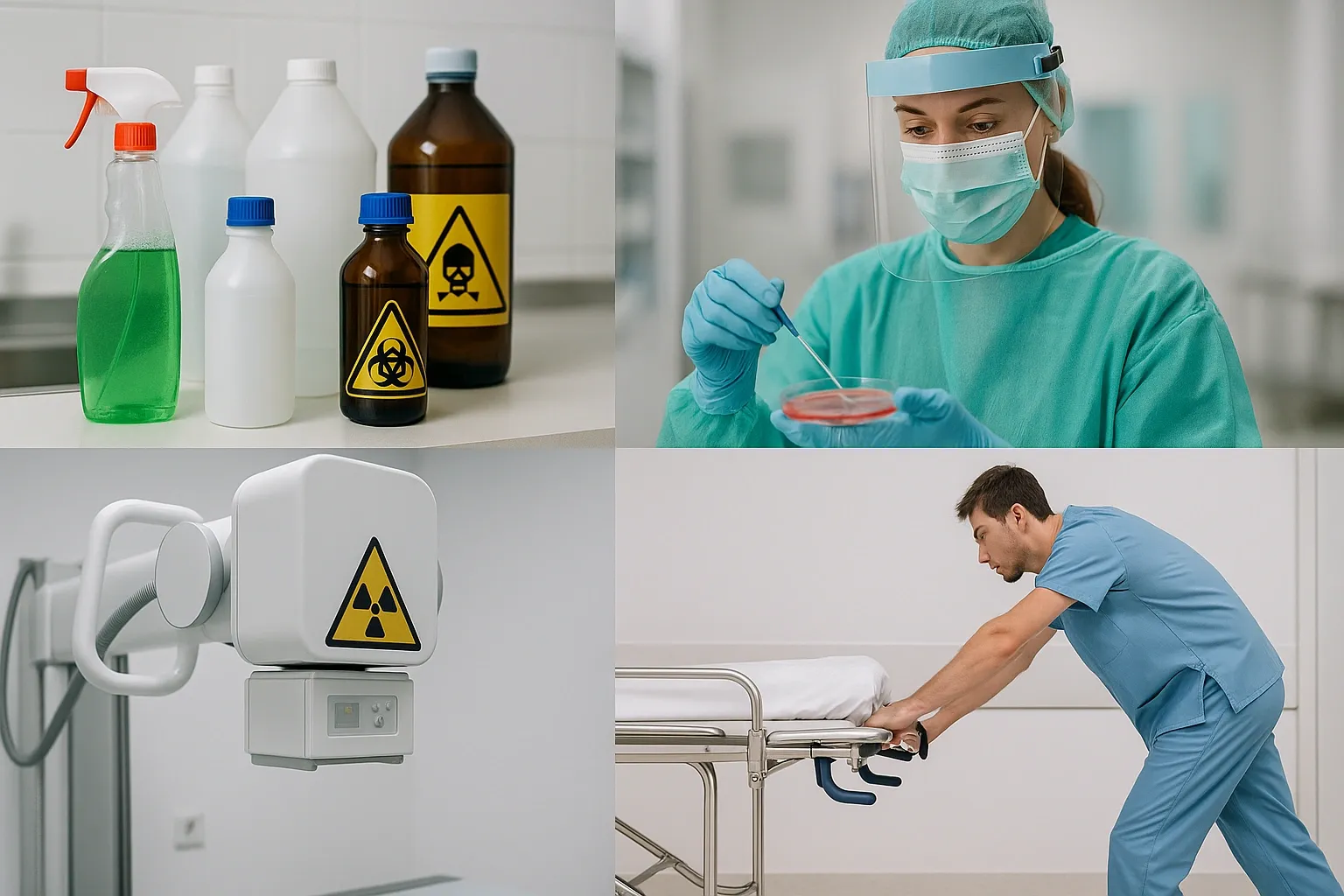 - Risco Biológico: Relativo à exposição a agentes biológicos, como vírus, bactérias e outros patógenos, presentes em fluidos corporais, resíduos médicos, entre outros.