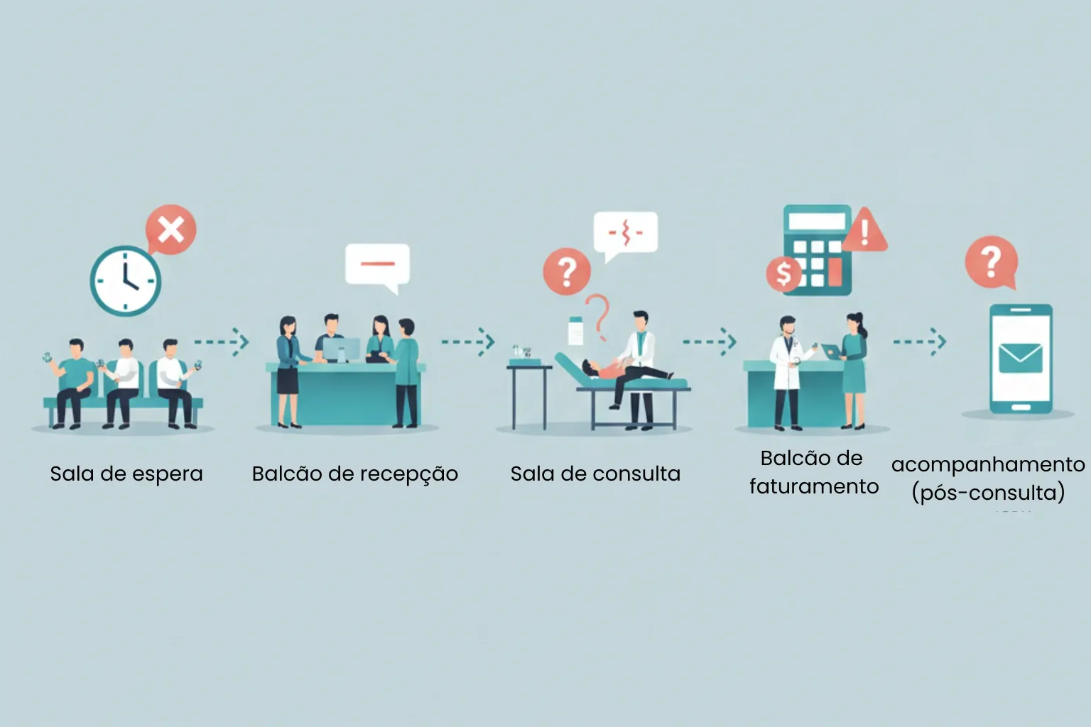- Pós-consulta inexistente (sem lembretes, sem retorno estruturado, dúvidas acumuladas).