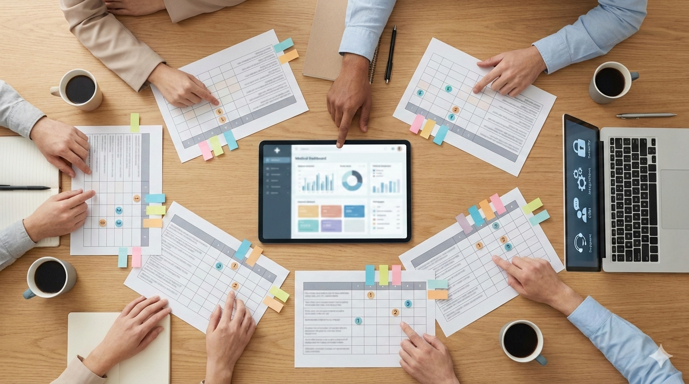 - Escolha critérios com peso (0 a 3, por exemplo): prontuário, agenda, financeiro, convênios, CRM, segurança, integrações e suporte.