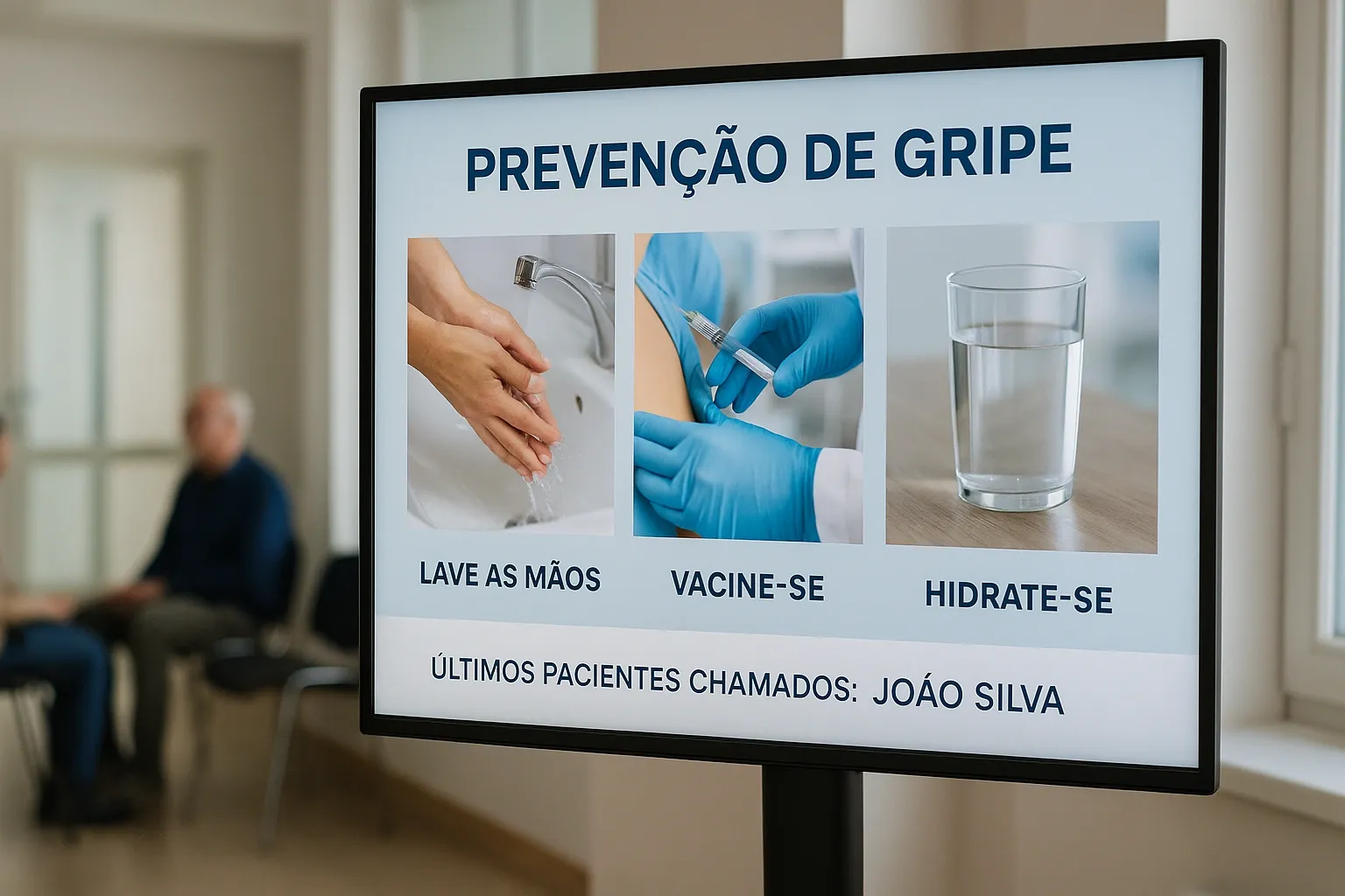 Campanhas Educativas sobre Saúde - Use o painel para veicular conteúdos educativos de curta duração: prevenção de doenças sazonais, orientações de preparo para exames, calendário de vacinação, hábitos de vida saudáveis. Além de aumentar a percepção de autoridade, esse conteúdo reduz dúvidas na recepção e melhora a adesão a tratamentos e retornos.